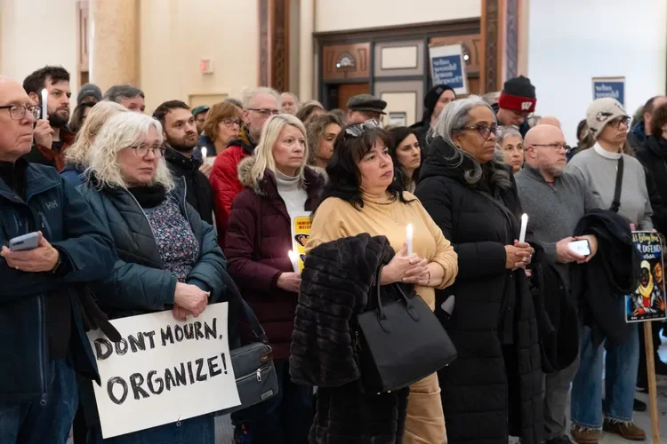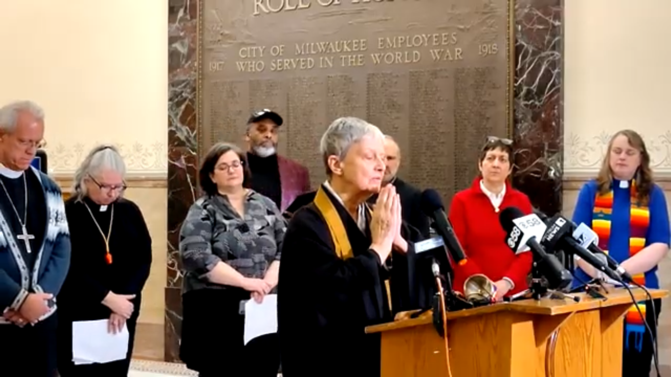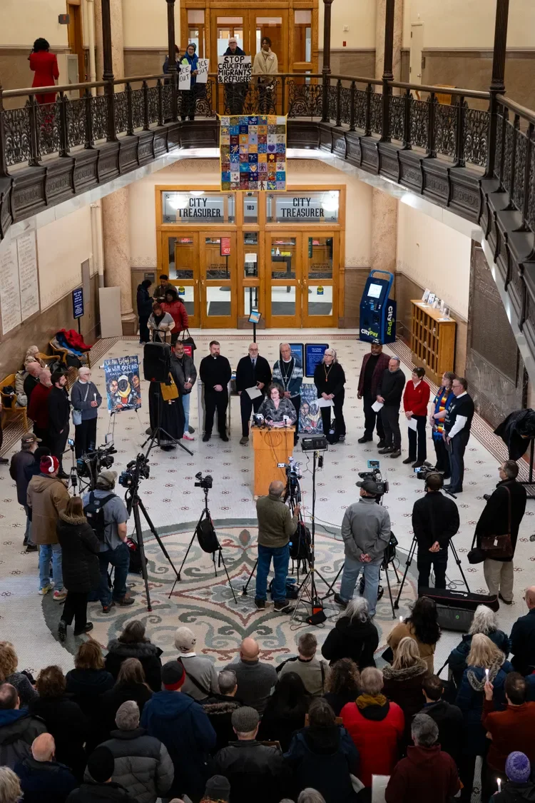 A large crowd assembled in the rotunda of the Milwaukee City Hall on Monday, January 26, 2026. At short notice, clergy and lay leaders from various churches, synagogues and temples had come out in extremely cold temperatures to show support for immigrants who have been brutally snatched up by ICE and Border Patrol agents to be detained and eventually deported. Also observers and bystanders have been targeted, and two people were fatally shot. The Interfaith Conference of Greater Milwaukee in conjunction with Forward Latino called for a prayer vigil, which became at the same time a nonviolent protest. It was a moving event, and many people were in tears.